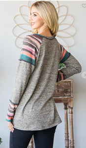 LONG SLEEVE V NECK SOLID AND STRIPE PRINT CONTRAST TOP WITH STITCH DETAIL